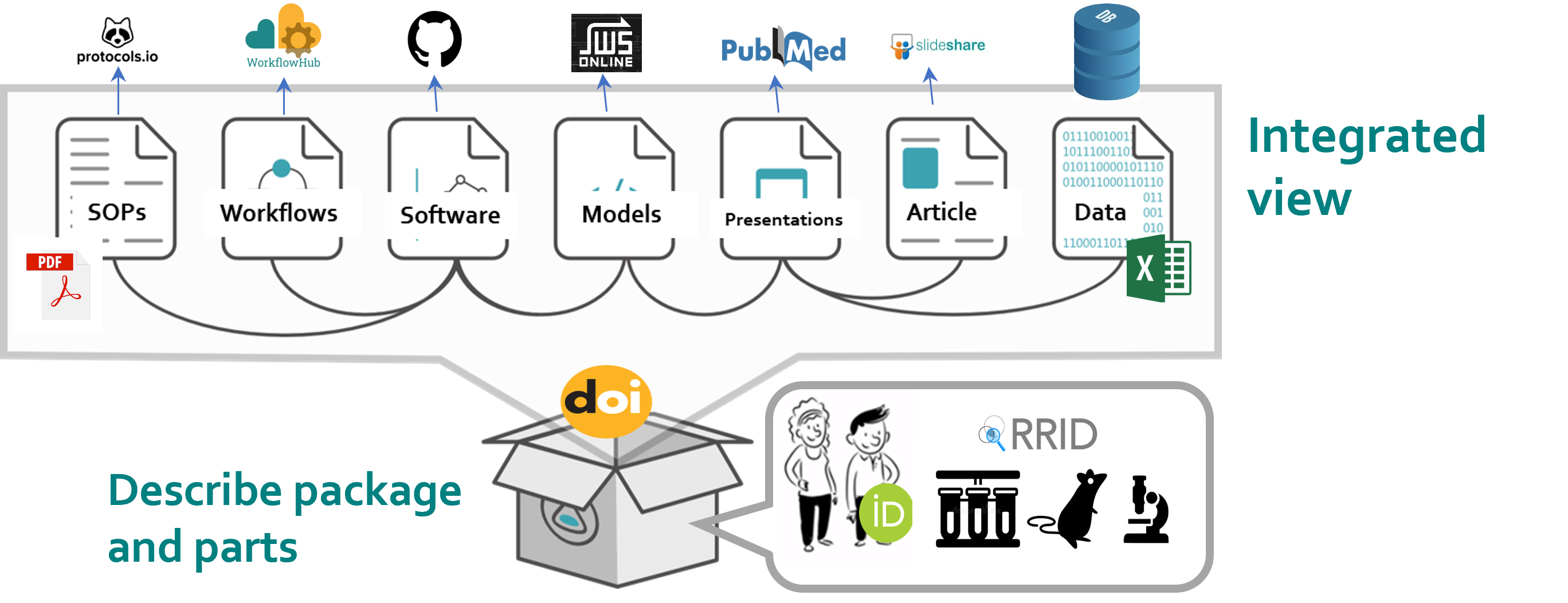 A RO-Crate is an integrated view through which you can see an entire Research Object; the methods, the data, the output and the outcomes of a project or a piece of work. Linking all this together enables the sharing of research outputs with their context, as a coherent whole. https://www.researchobject.org